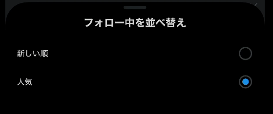 『フォロー中を並べ替え』という項目が表示されて『人気』順か、『新しい順』(時系列順)へと変更できます。元の時系列順に戻したい場合は『新しい順』をご選択ください。
